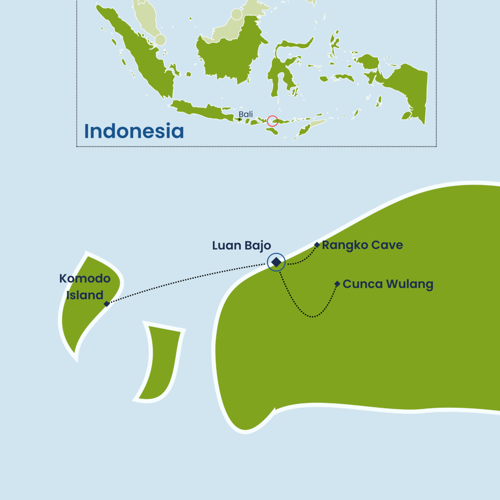 Embark on a 5-day adventure in Flores, Indonesia, where natural wonders and unique wildlife await. Begin in Labuan Bajo, soaking in serene coastal views and vibrant sunsets. Explore Komodo Island with a guided trek to see the legendary Komodo Dragons, then relax on the rare pink sands of Pantai Merah and snorkel with majestic manta rays at Manta Point. Island-hop to Kanawa, Bidadari, and Sabolo, and discover the hidden saltwater oasis of Rangko Cave. Hike through lush rainforests, swim in the refreshing Cunca Wulang Canyon, and enjoy panoramic views from Batu Cermin Cave and Panorama Point. The journey concludes with a farewell dinner, leaving memories of Flores’ dramatic landscapes, vibrant marine life, and unforgettable adventures.