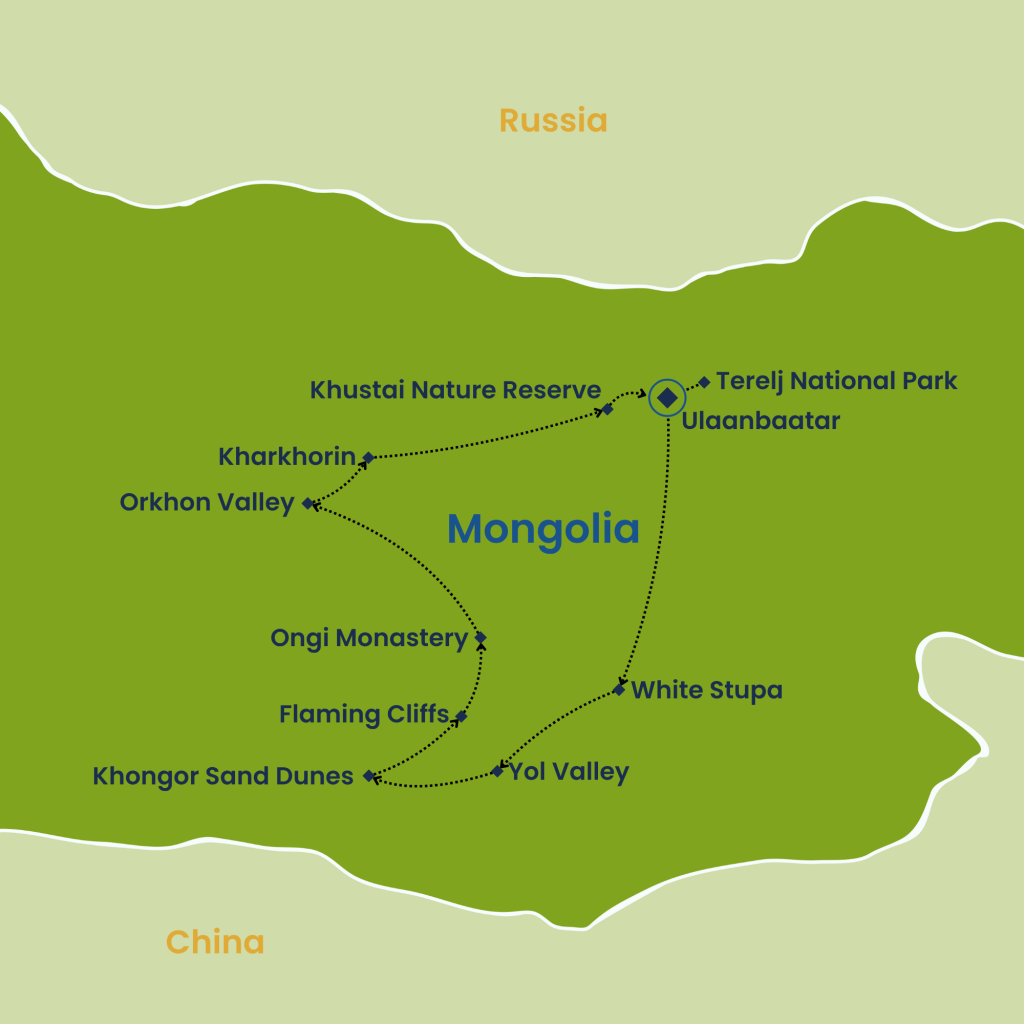 Explore Mongolia on a 12-day journey showcasing its dramatic landscapes and rich history. Begin in Ulaanbaatar, then venture into the Gobi Desert to witness White Stupa cliffs, Yol Valley, and the stunning Khongor Sand Dunes. Discover the Flaming Cliffs and Ongi Monastery before heading to Orkhon Valley and the historic city of Kharkhorin, home to Erdene Zuu Monastery. At Kharkhorin you will participate in the Naadam Festival, a vibrant celebration of traditional sports showcasing the rich cultural heritage and nomadic spirit of the Mongolian people. Experience the wild beauty of Khustai Nature Reserve, spotting rare Przewalski horses, and unwind in Terelj National Park, exploring Turtle Rock and nomadic culture. Conclude with a visit to the iconic Chinggis Khaan Statue and Ulaanbaatar’s cultural landmarks. A truly unforgettable adventure!