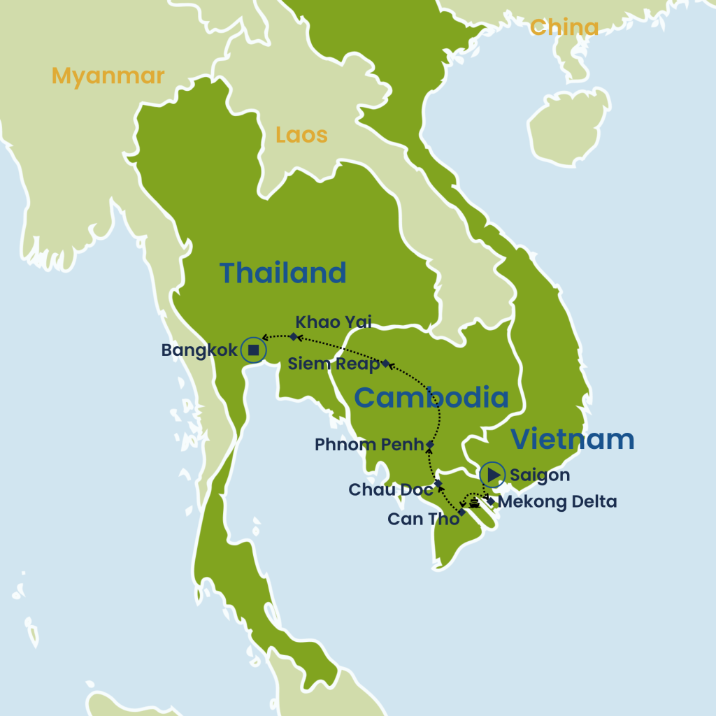 Discover the vibrant cultures and natural wonders of Southeast Asia on this immersive 15-day adventure. Begin in bustling Saigon, explore the Cu Chi Tunnels, and cruise the Mekong Delta. Continue to Cambodia to visit Phnom Penh’s historic landmarks and the awe-inspiring Angkor Wat in Siem Reap. Cross into Thailand for nature excursions in Khao Yai National Park, before ending in Bangkok with canal tours and a serene dinner cruise. Highlights include vibrant markets, ancient temples, lush landscapes, and iconic cityscapes. Perfect for travelers seeking culture, history, and nature all in one journey.