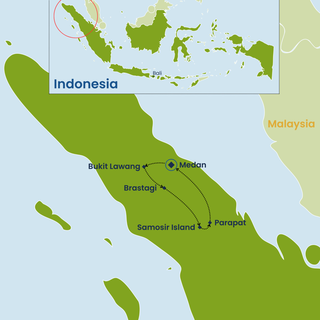 Experience the wild beauty and cultural heritage of North Sumatra on this 6-day journey. Begin in Bukit Lawang, gateway to Leuser National Park, where jungle treks reveal orangutans, gibbons, and exotic wildlife. Continue to the cool highlands of Brastagi, exploring volcanic vistas, bustling fruit markets, and the serene Shwedagon-inspired pagoda. Travel on to Samosir Island in the middle of Lake Toba, the world’s largest volcanic lake, pausing at cascading waterfalls, traditional Batak villages, and sweeping viewpoints. Discover ancient stone relics, royal tombs, and weaving traditions before ending with a farewell dinner by the lake. A perfect blend of nature, culture, and unforgettable scenery.